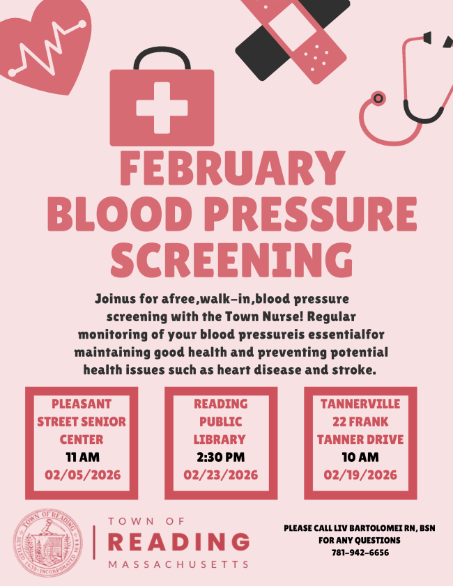 Take a proactive step toward better health - stop by for a free, walk-in blood pressure screening with the Town Nurse.
