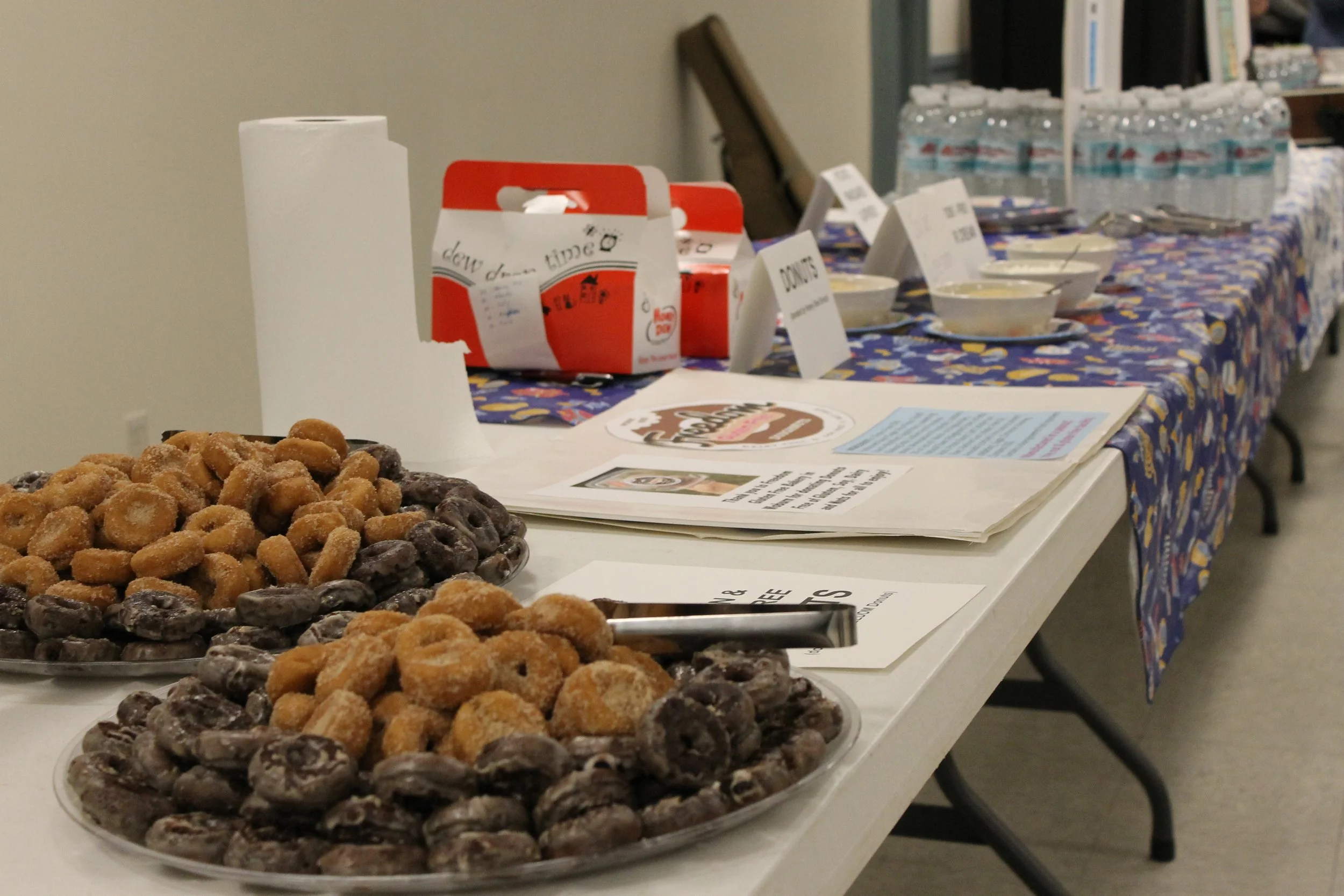 Donuts with various dipping sauces and water available for attendees after the program at the Menorah Lighting. Photo by Taylor Gregory.