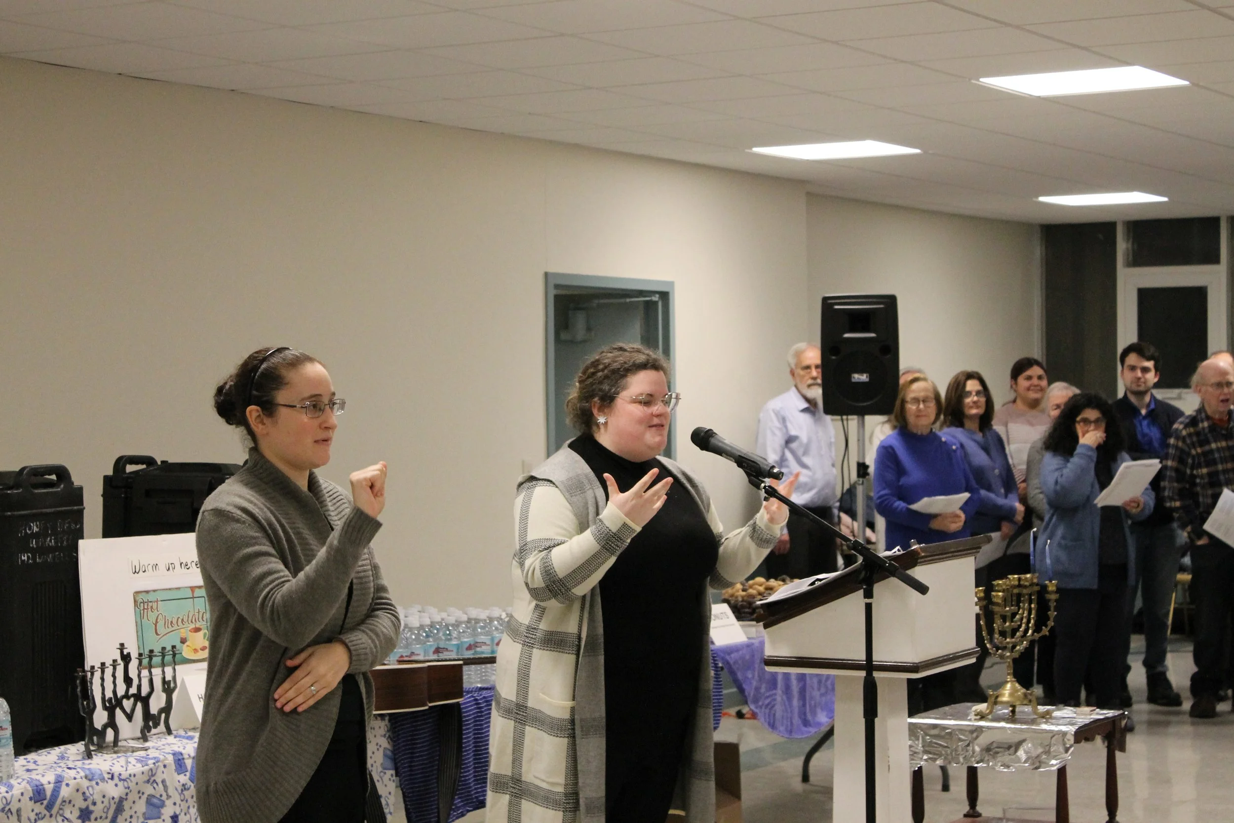 An American Sign Language (ASL) interpreter was present to ensure full accessibility, and the Reading Community Singers gave festive performances. Attendees enjoyed a welcoming table of refreshments, featuring donuts, latkes, hot chocolate, and water. Alongside the festivities, donations were collected for the Reading Food Pantry.