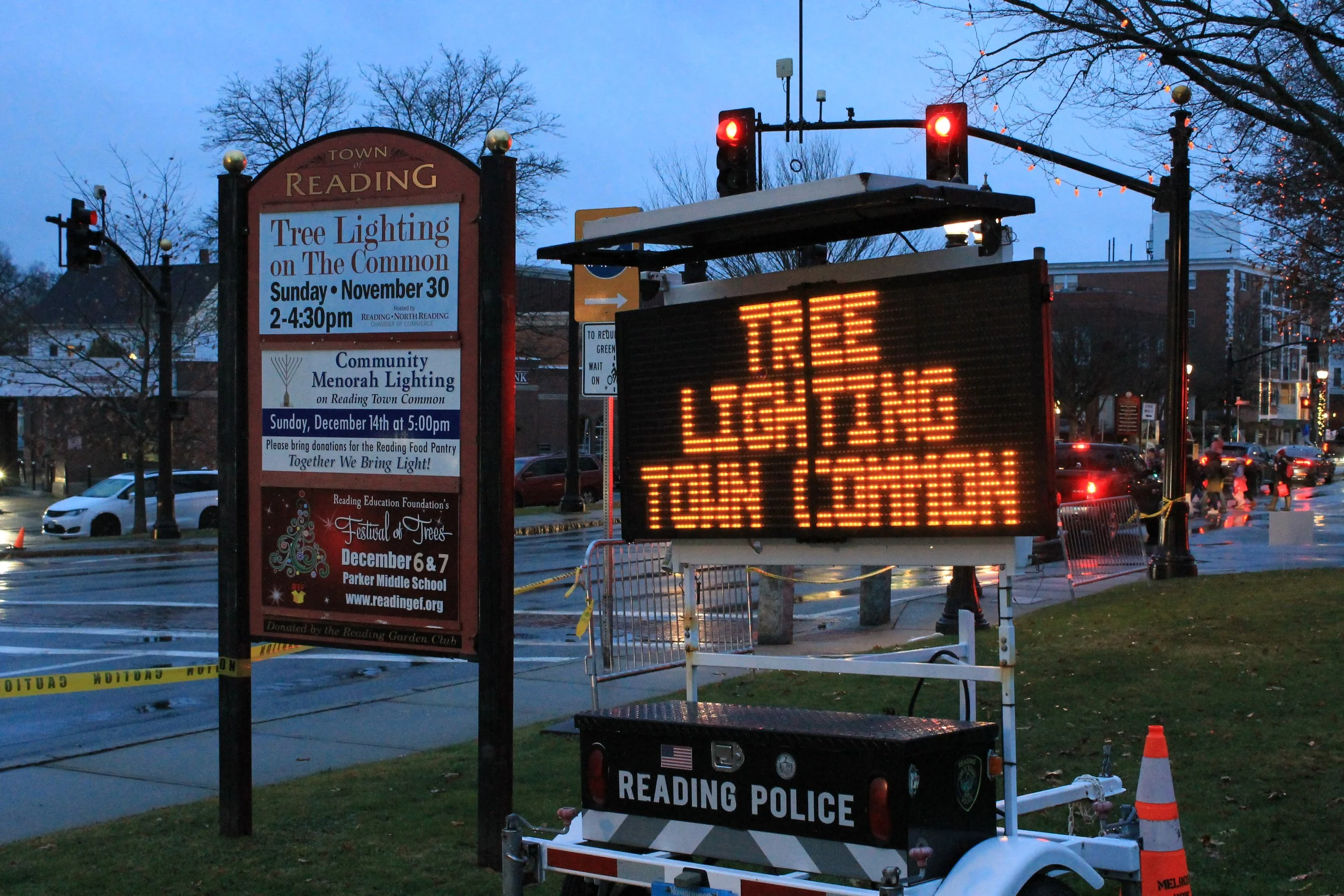 Signage on the Town Common for the Tree Lighting event, along with the upcoming Festival of Trees and Menorah Lighting. Photo by Taylor Gregory.