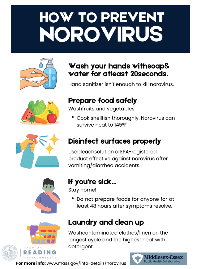 Because norovirus can spread easily in indoor settings and through minimal contact, taking these steps helps protect your family, workplace, and community during peak norovirus season. Visit the Mass.gov website for more information and additional resources.