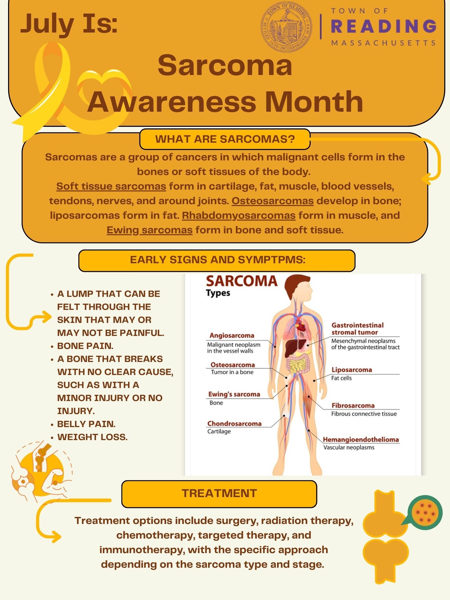 Every July, communities across the country recognize Sarcoma Awareness Month - a time to bring attention to a rare and often misunderstood group of cancers that form in the bones or soft tissue of the body. The Town of Reading joins this important observance to help raise awareness, promote early detection, and support those affected.