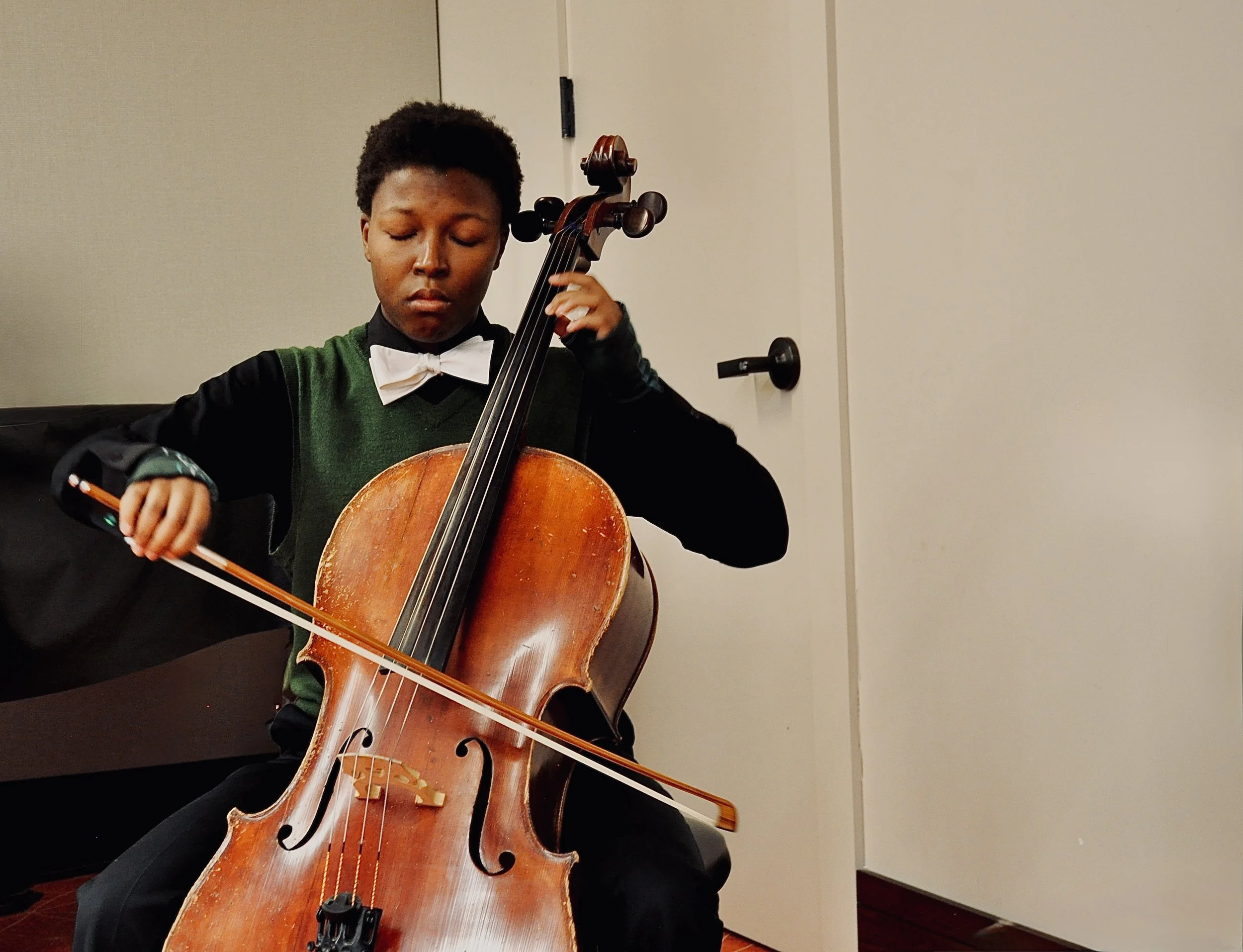 A student musician, T Saille, performs on cello, providing a live musical interlude to conclude the event. Photo by Aaron Soto.
