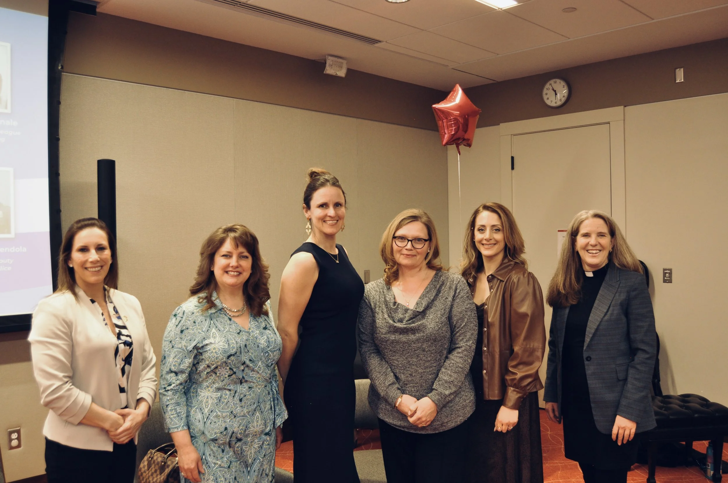 Event panelists gather for a group photo, representing a range of local organizations and leadership roles. Pictured (left to right): Deputy Chief Christine Amendola, Liz Whitelam, Sarah Samuels, Jayne Wellman, Ashley Spinale, and Pastor Mary Curlew. Photo by Aaron Soto.