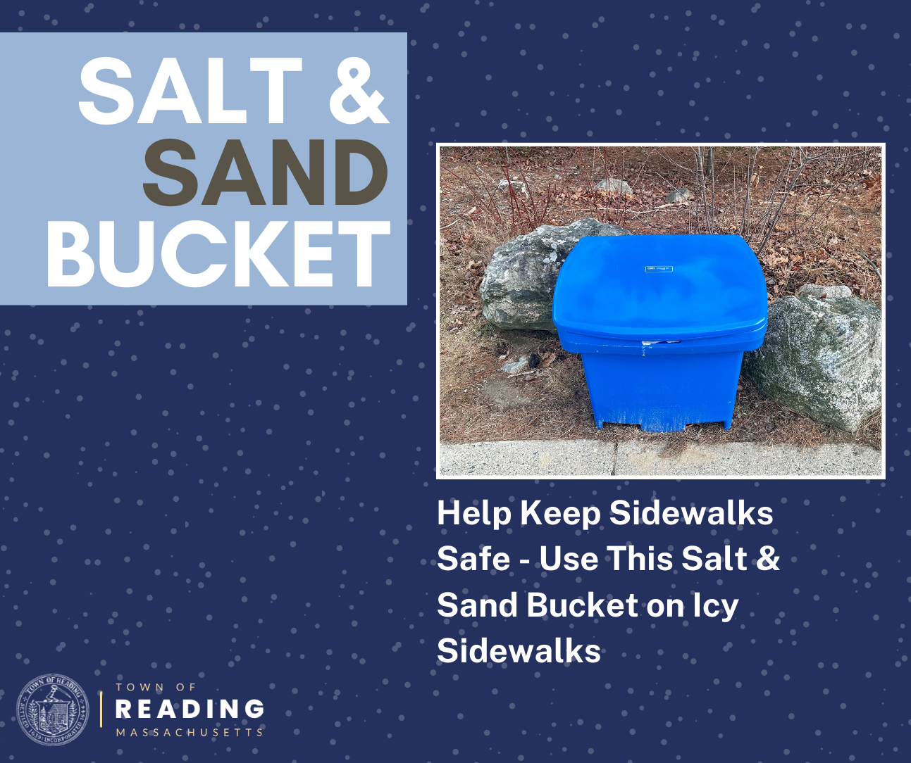 During snow and ice events, Reading DPW crews are often working through the night to plow over 200 lane miles of roadways to keep roads safe for residents which includes the plowing of every Town and school parking lot and over 45 miles of sidewalks. There is a way residents can help. Reading DPW places blue salt/sand buckets in high-traffic pedestrian areas around Town for public use during snow and ice conditions. These are free to use, help reduce slips and falls and are available for residents to assist with icy patches. Public Works unfortunately does not have the capability to salt sidewalks, so if you see an icy area, feel free to use a bucket to help make walkways safer for everyone!