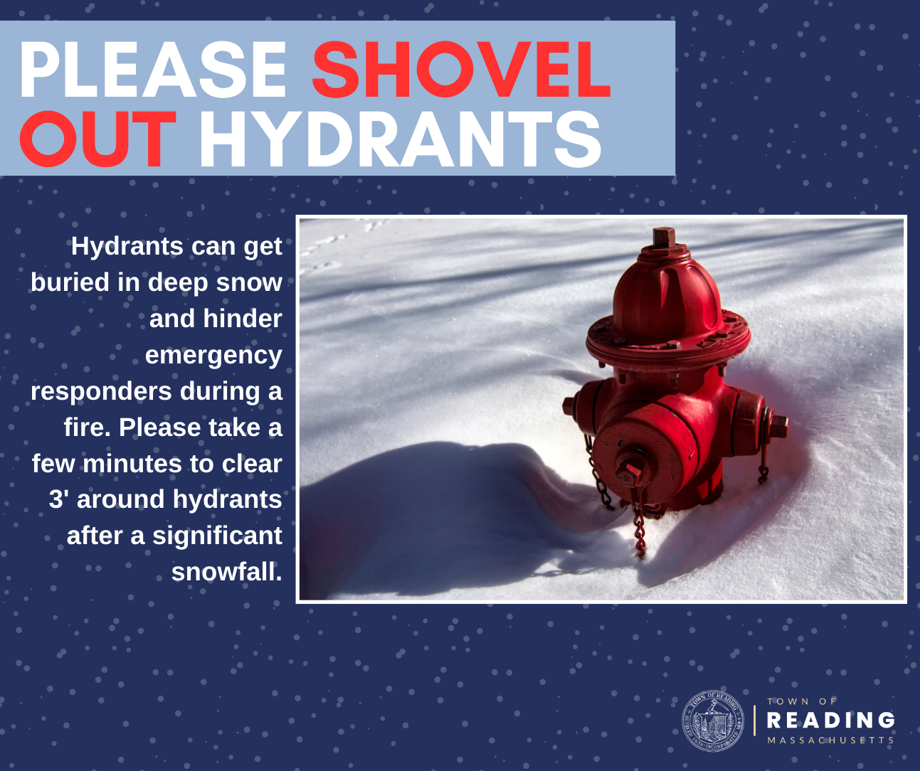 After snowstorms, please take a moment to clear snow and ice from fire hydrants near your home or business, if you are able. The Town has over 850 hydrants and any help would greatly assist DPW. Always remember to clear a 3-foot radius around the hydrant, make sure the nozzle and caps are visible and create a path from the sidewalk or street. Clearing hydrants helps firefighters respond quickly in an emergency, every second counts.