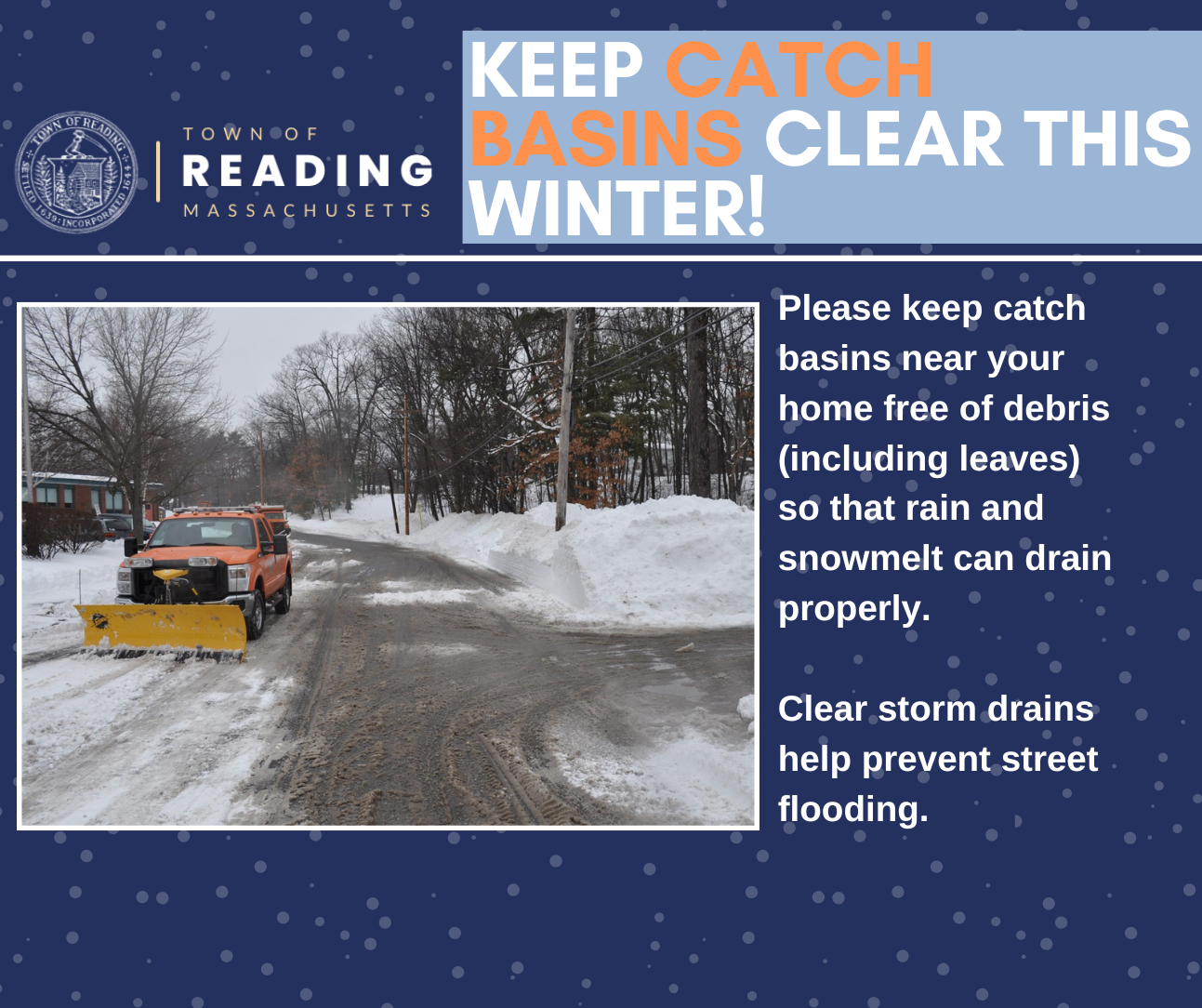 The Town has over 3,000 catch basins. When snowbanks start to cover over these catch basins, residents can help DPW by shoveling out the catch basin in front of your home if you are able. Digging out a catch basin after a snowstorm allows melting snow and rainwater to go into the catch basins without flooding the roadway.