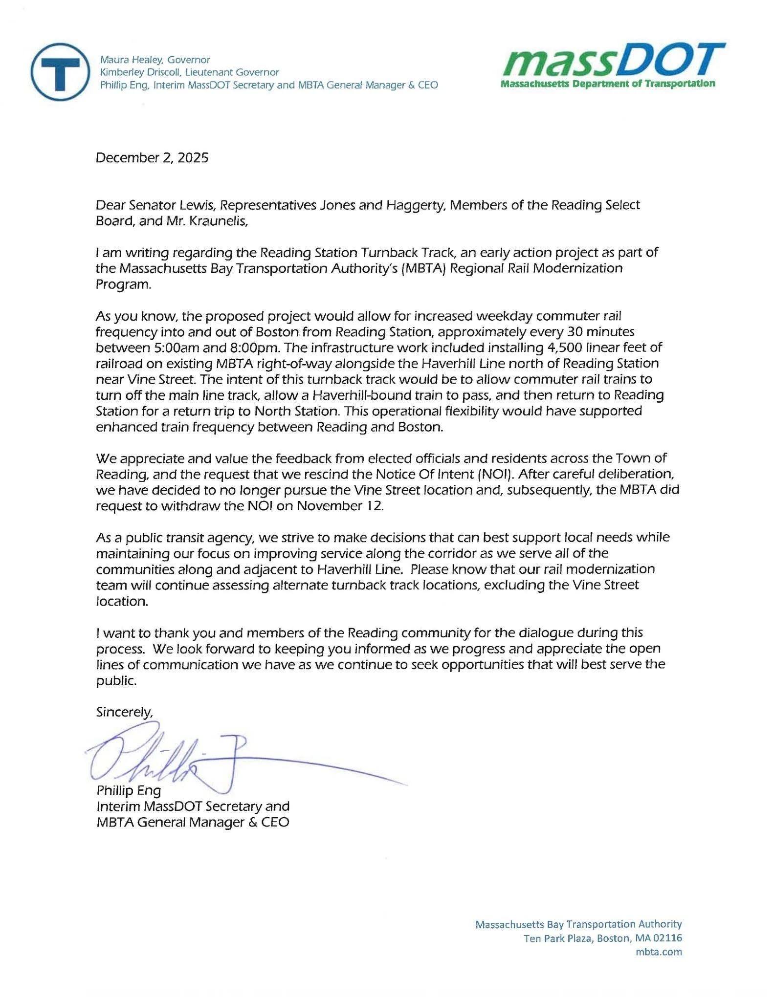 On December 2, 2025, Interim Massachusetts Department of Transportation (MassDOT) Secretary of Transportation and MBTA General Manager Phillip Eng issued a formal letter to local and state officials in Reading, announcing a significant shift in the long-discussed Reading Station Turnback Track project. The letter confirms that the MBTA has rescinded its Notice of Intent (NOI) for the proposed Vine Street site and will no longer pursue that location for turnback infrastructure.