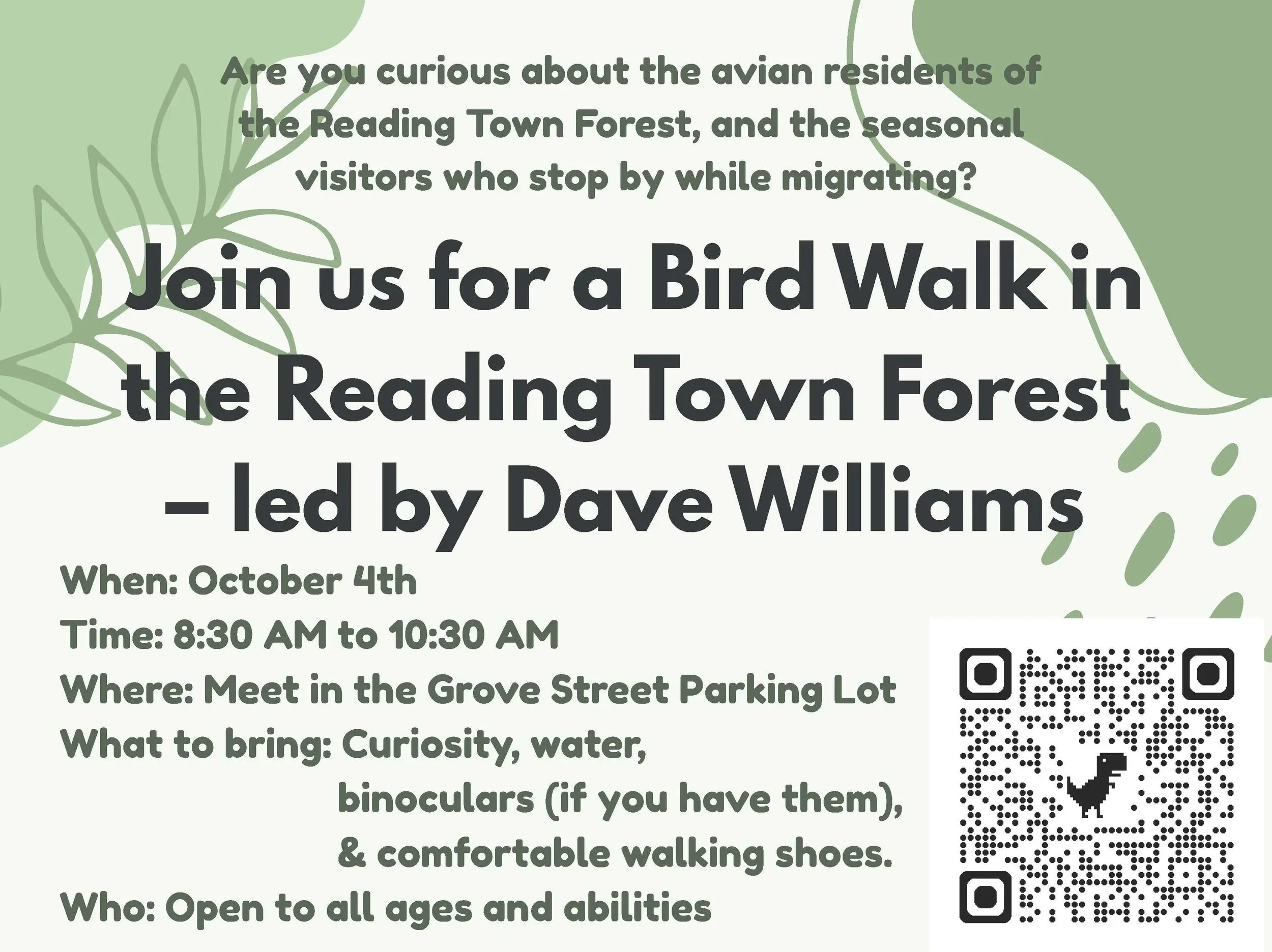 Are you curious about the feathered residents of the Reading Town Forest, as well as the many seasonal visitors who stop by during migration? The Town Forest Committee is hosting a guided Bird Walk with experienced birder and educator Dave Williams on Friday, October 4, from 8:30 to 10:30 am.