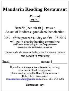 RCTV is inviting the community to join them for a special fundraising night at Mandarin Reading on Friday, October 17, 2025. Guests can enjoy a delicious meal while supporting local community television.