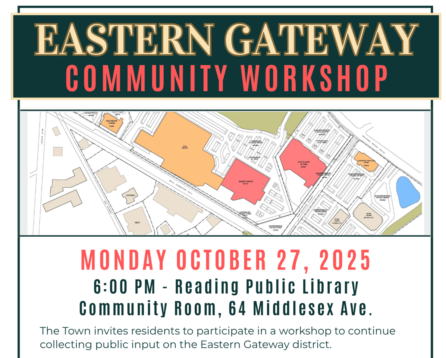 The Town is hosting a Community Meeting at the Reading Public Library on Monday October 27th at 6:00 pm to share the findings and community feedback on the Eastern Gateway – an area along Walkers Brook Drive under consideration for new zoning and growth opportunities. This is a chance to directly hear what residents and neighbors have said to date, as well as to provide your own input and thoughts on the future of this area. We encourage your attendance and are looking forward to continuing the effort together.