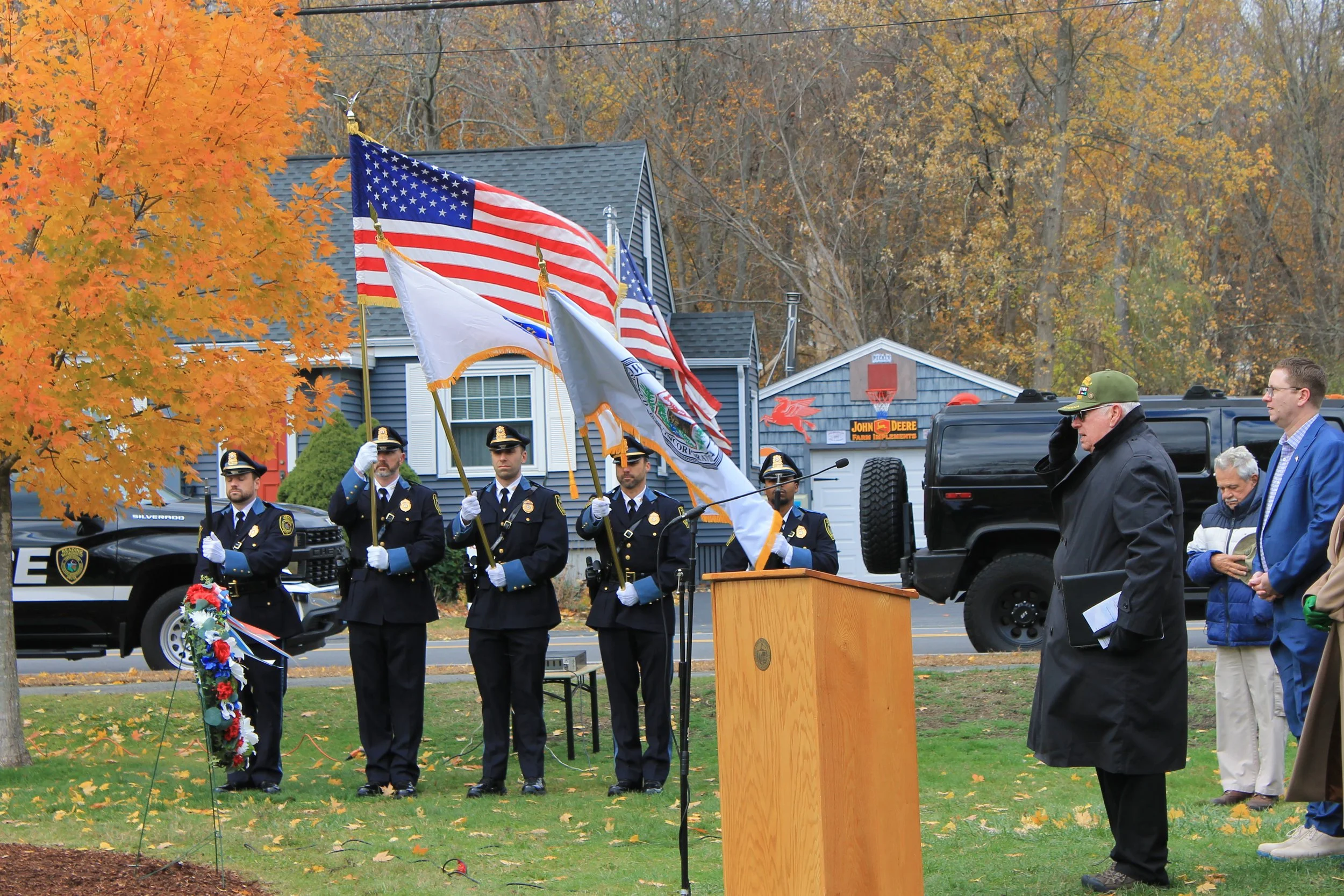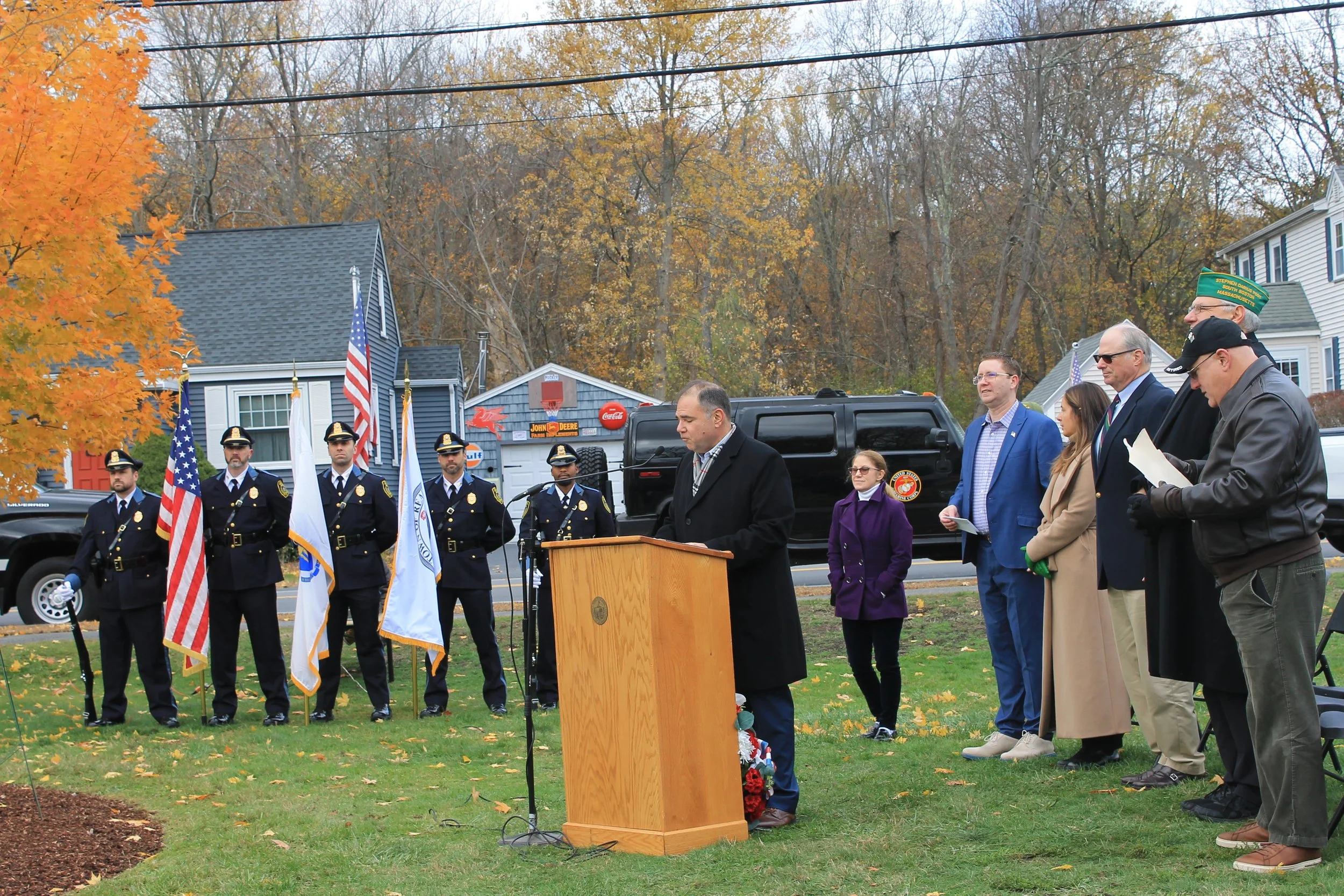 Town Manager Matt Kraunelis is delivering the opening remarks at the Veterans Day Ceremony at Memorial Park. Photo by Taylor Gregory.