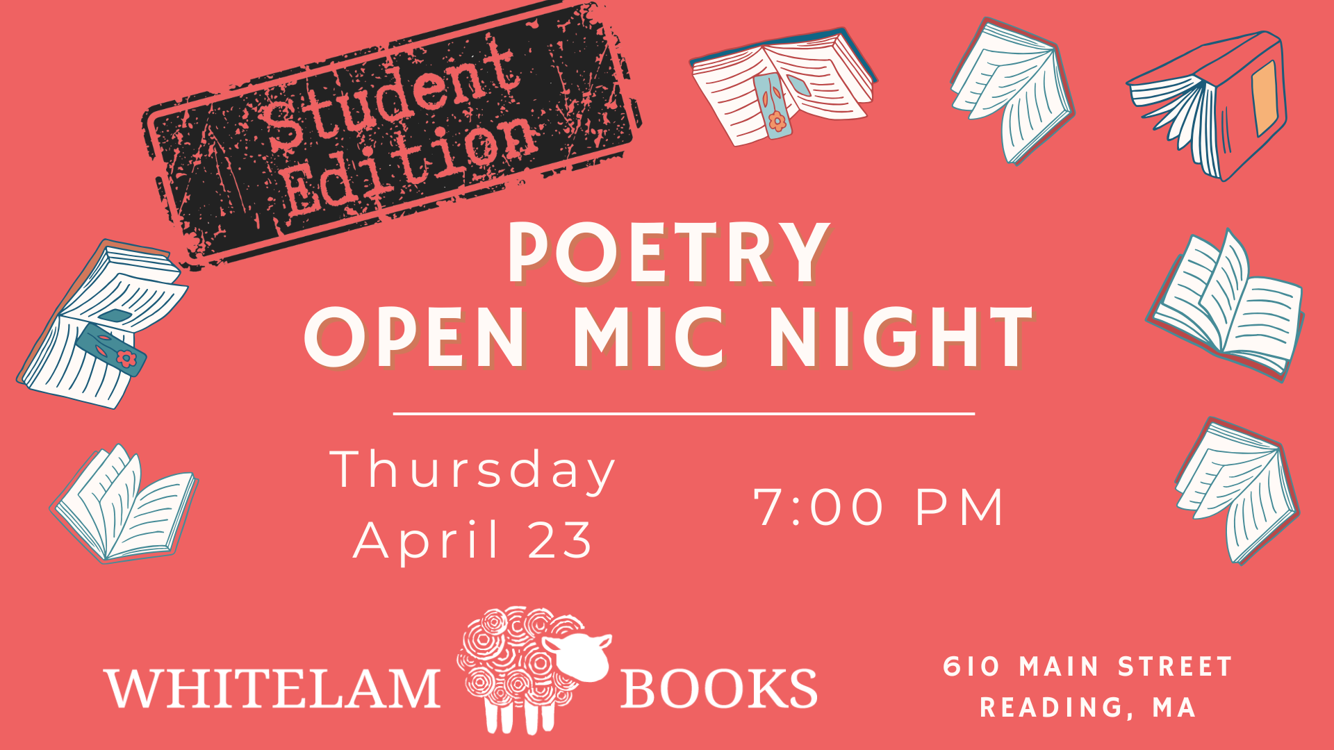 Reading, MA - Whitelam Books is excited to host for one night only a Poetry Open Mic Night: Student Edition event on Thursday, April 23 from 7:00-8:00PM. All featured poets at this gathering will be students! Adults are welcome to come listen and support local student poets.