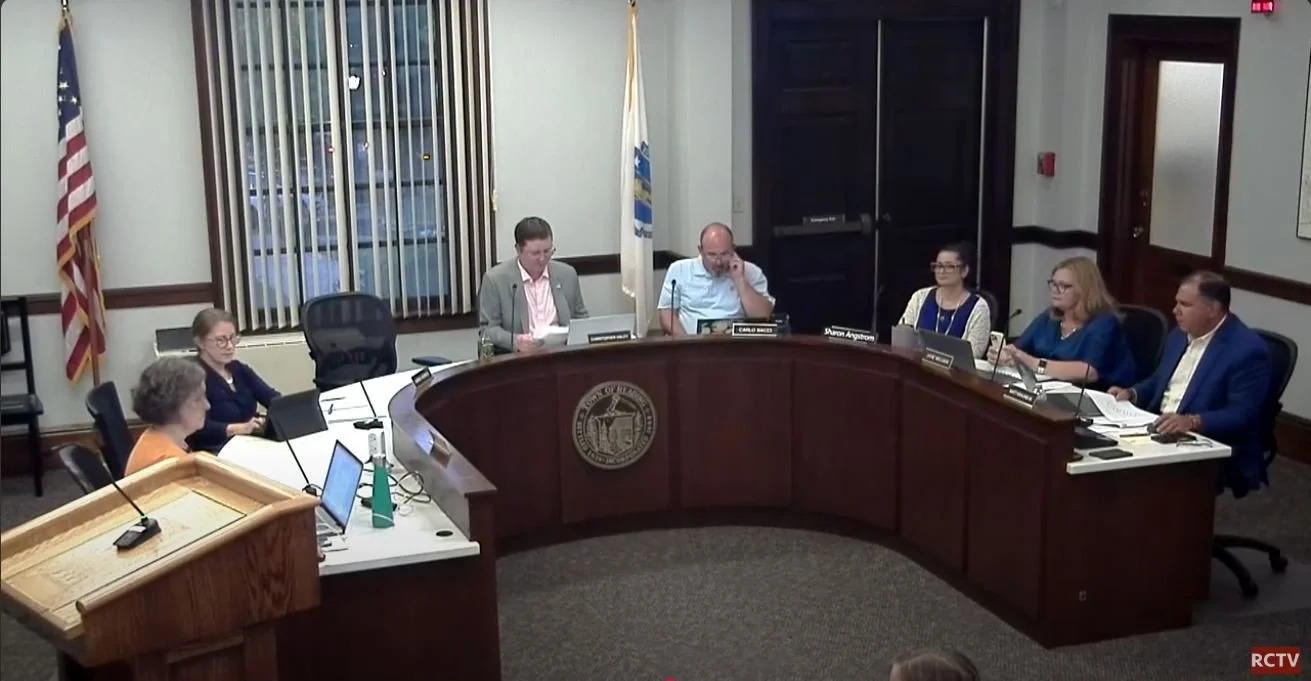 Image of the August 5, 2025 Select Board meeting from the RCTV Youtube page. Pictured (left to right): Board members Karen Rose-Gillis, Karen Herrick, Chris Haley, Carlo Bacci, Town Accountant Sharon Angstrom, Assistant Town Manager Jayne Wellman, and Town Manager Matt Kraunelis. Member Melissa Murphy attended via Zoom.