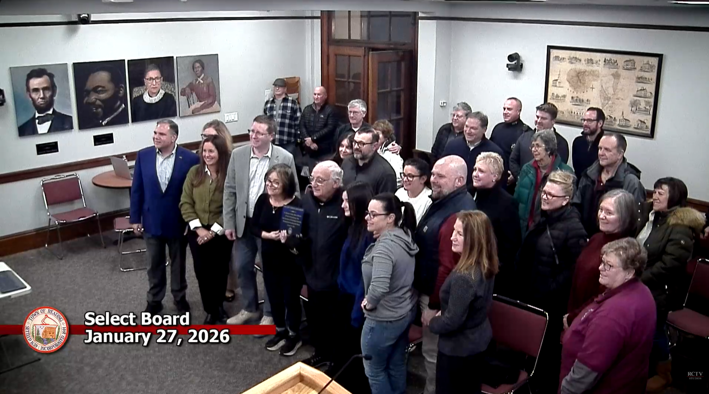 Image of the January 27, 2026, Select Board meeting from the RCTV Youtube page. Owners of The Last Corner Restaurant pose with Town leadership and community members while being recognized for 50 years in Reading.
