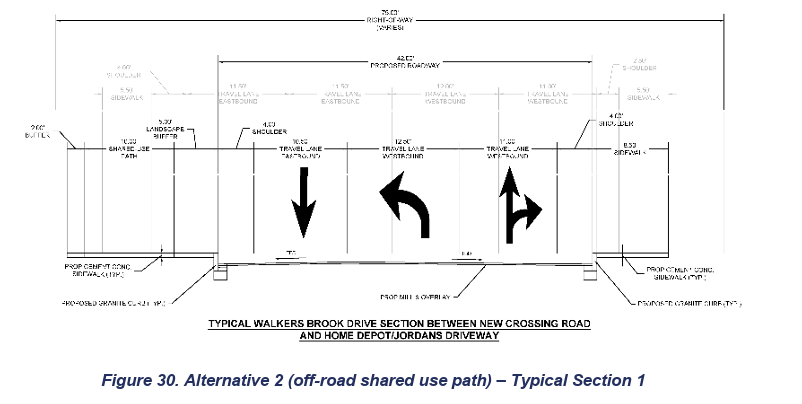 Image from the Walkers Brook Drive Design Report - January 2026, Alternative 2 (off-road shared use path) section of road between New Crossing Road and Home Depot/Jordan’s Driveway.